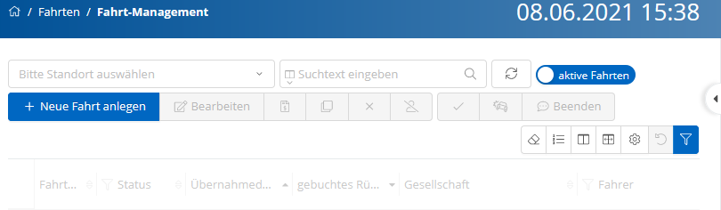 Um eine neue Fahrt anzulegen, klicken Sie auf die Schaltfläche. Eine detaillierte Beschreibung zur Erstellung einer neuen Fahrt finden Sie hier.