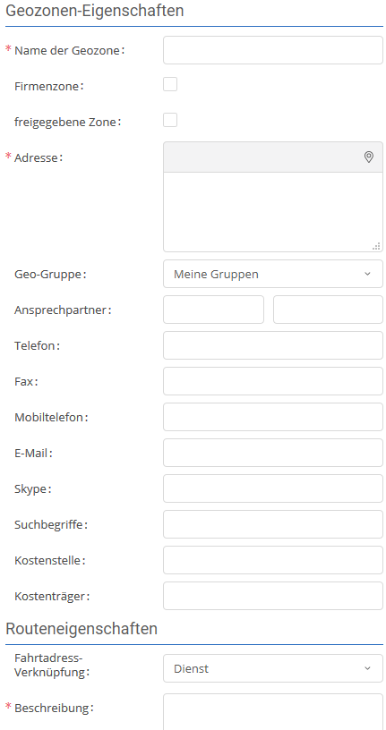 In der Geozonenverwaltung können Sie mithilfe der verschiedenen Werkzeuge die Form und die Größe der Geozone festlegen und die Geozoneneigenschaften eintragen. Alle hier hinterlegten Daten werden zukünftig automatisch für die verknüpfte Adresse in das Fahrtenbuch übernommen.
