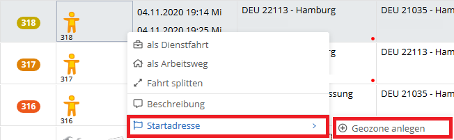 Wenn Sie eine Adresse Ihren Geozonen hinzufügen möchten, klicken Sie mit der rechten Maustaste auf die entsprechende Fahrt, wählen die Fahrt und klicken anschließend auf Geozone anlegen.