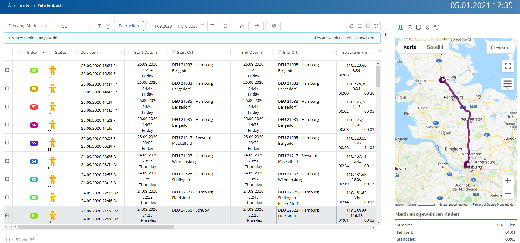 In der Übersicht werden Ihnen die Fahrten des gewählten Zeitraums angezeigt. Dabei steht die aktuellste Fahrt oben. Wenn Sie auf eine Fahrt klicken, wird Ihnen der Streckenverlauf rechts auf der Karte angezeigt.